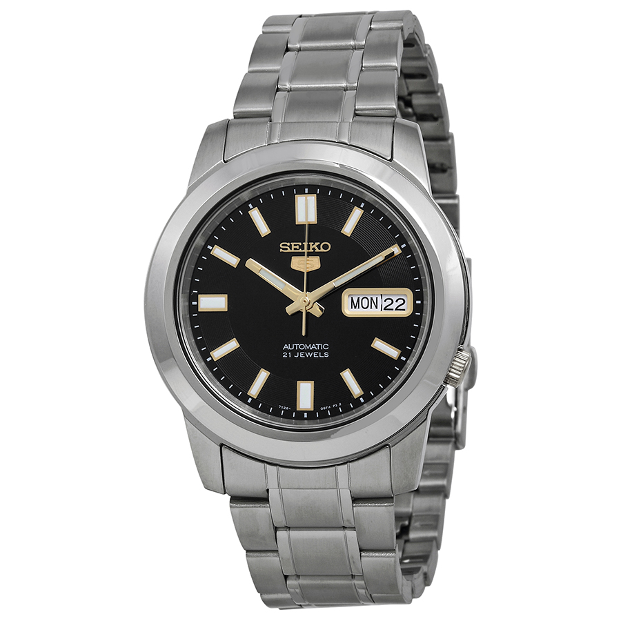 Stainless steel case with a stainless steel bracelet. Fixed stainless steel bezel. Black dial with luminous gold-tone hands and index hour markers. Minute markers around the outer rim. Dial Type: Analog. Luminescent hands and markers. Date and day of the week display at the 12 o'clock position. Automatic movement with a 41-hour power reserve. Scratch resistant Hardlex crystal. Push / pull crown. Skeleton case back. Case diameter: 38 mm. Case thickness: 12 mm. Band width: 20 mm. Band width: 19.5 mm. Deployment clasp with a push button release. Water resistant at 30 meters / 100 feet. Functions: date, day, hour, minute, second. Casual watch style. Seiko 5 Automatic Stainless Steel Black Dial Mens Watch SNKK17