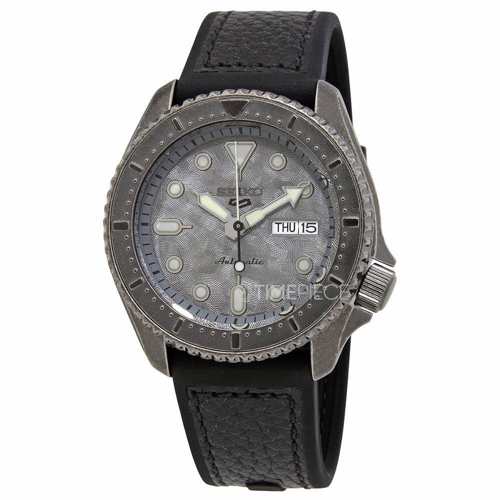 Grey-plated stainless steel case with a black silicone strap with a (stiched) black leather top. Uni-directional rotating grey-plated bezel with an inlaid grey ring. Grey dial with luminous hands and dot hour markers. Minute markers around the outer rim. Dial Type: Analog. Luminescent hands and markers. Day of the week and date display at the 3 o'clock position. Seiko caliber 4R36 automatic movement, containing 24 Jewels, bitting at 21600 vph, and has a power reserve of approximately 41 hours. Scratch resistant Hardlex crystal. Pull / push crown. Transparent case back. Round case shape. Case size: 42.5 mm. Case thickness: 13.4 mm. Tang clasp. Water resistant at 100 meters / 330 feet. Functions: date, day, hour, minute, second. 5sports Series. Sport watch style. Watch label: Japan Movt. Seiko 5Sports Automatic Grey Dial Mens Watch SRPE79K1.