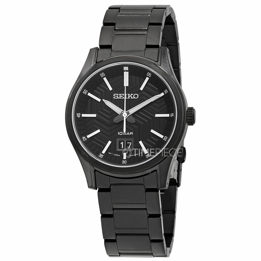 Black IP stainless steel case and bracelet. Fixed black IP stainless steel bezel. Black dial with silver-tone hands and index hour markers. Arabic numeral minute markers (at 5 minute intervals). Dial Type: Analog. Date display at the 6 o'clock position. Seiko Caliber 6N76 quartz movement. Scratch resistant sapphire crystal. Solid case back. Round case shape, case size: 39.5 mm, case thickness: 9.8 mm. Band width: 20 mm. Fold over clasp with a safety release. Water resistant at 100 meters / 330 feet. Functions: big date, hour, minute, second. Big Date Series. Sport watch style. Watch label: Japan Movt. Seiko Big Date Quartz Black Dial Mens Watch SUR515P1.