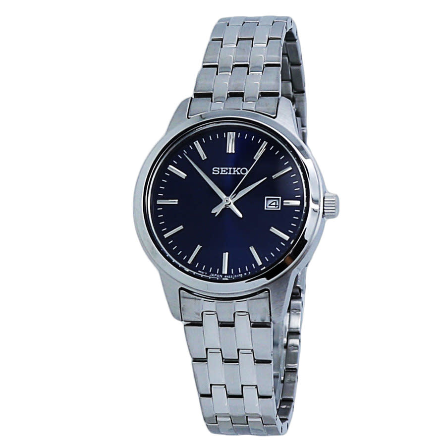 Silver-tone stainless steel case and bracelet. Fixed silver-tone stainless steel bezel. Blue dial with silver-tone dauphine-style shape hands and index hour markers. Minute markers around the outer rim. Dial Type: Analog. Date display at the 3 o'clock position. Quartz movement. Scratch resistant mineral crystal. Pull / push crown. Solid case back. Round case shape, case size: 30 mm, case thickness: 7.8 mm. Water resistant at 50 meters / 165 feet. Functions: date, hour, minute, second. Classic Series. Casual watch style. Watch label: Japan Movt. Seiko Classic Quartz Blue Dial Ladies Watch SUR407.