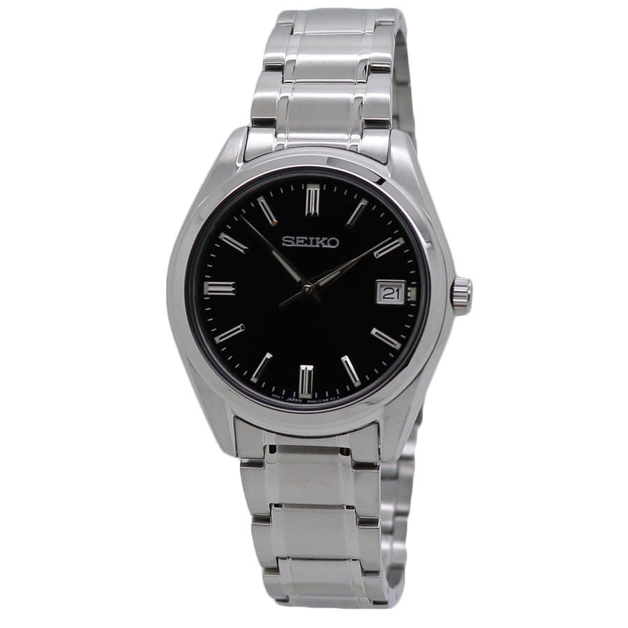 Stainless steel case with a stainless steel bracelet. Fixed stainless steel bezel. Black dial with luminous silver-tone hands and index hour markers. Minute markers around the outer rim. Dial Type: Analog. Luminescent hands and markers. Date display at the 3 o'clock position. Quartz movement. Scratch resistant sapphire crystal. Pull / push crown. Solid case back. Round case shape. Case size: 35.7 mm. Case thickness: 8 mm. Band width: 17 mm. Fold over clasp with a push button release. Water resistant at 100 meters / 330 feet. Functions: date, hour, minute, second. Classic Series. Casual watch style. Watch label: Japan Movt. Seiko Classic Quartz Black Dial Mens Watch SUR319P1.