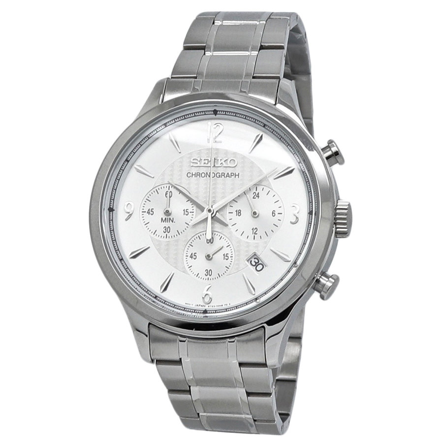 Stainless steel case with a stainless steel bracelet. Fixed stainless steel bezel. Silver dial with silver-tone hands and index hour markers. Arabic numerals mark the 3, 6, 9 and 12 o'clock positions. Minute markers around the outer rim. Dial Type: Analog. Date display between the 4 and 5 o'clock positions. Chronograph - three sub-dials displaying: 60 second, 60 minute and 24 hour. Quartz movement. Scratch resistant mineral crystal. Pull / push crown. Solid case back. Round case shape. Case size: 43 mm. Case thickness: 13 mm. Band width: 20 mm. Fold over clasp with a push button release. Water resistant at 100 meters / 330 feet. Functions: chronograph, hour, minute, second, date. Conceptual Series. Dress watch style. Seiko Conceptual Chronograph Quartz Silver Dial Mens Watch SSB337.