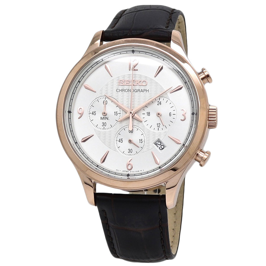 Rose gold-tone stainless steel case with a brown leather strap. Fixed rose gold-tone bezel. Silver dial with rose gold-tone hands and index hour markers. Arabic numerals mark the 3, 6, 9 and 12 o'clock positions. Minute markers around the outer rim. Dial Type: Analog. Date display between the 4 and 5 o'clock positions. Chronograph - three sub-dials displaying: 60 minutes, 60 seconds, 24 hours. Quartz movement. Scratch resistant mineral crystal. Pull / push crown. Solid case back. Round case shape. Case size: 43 mm. Case thickness: 13 mm. Band width: 20 mm. Tang clasp. Water resistant at 100 meters / 330 feet. Functions: chronograph, hour, minute, second, date. Dress watch style. Watch label: Japan Movt. Seiko Conceptual Chronograph Quartz Silver Dial Mens Watch SSB342.