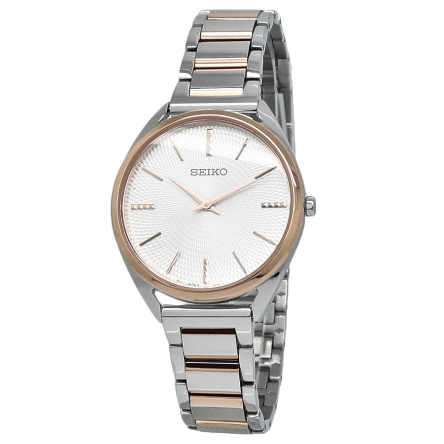 Stainless steel case with a two-tone (silver-tone and rose gold-tone) stainless steel bracelet. Fixed rose gold-tone bezel. Silver dial with rose gold-tone hands and index hour markers. Dial Type: Analog. Quartz movement. Scratch resistant Hardlex crystal. Pull / push crown. Solid case back. Round case shape. Case size: 32 mm. Case thickness: 8 mm. Band width: 15 mm. Fold over clasp with a double push button release. Water resistant at 50 meters / 165 feet. Functions: hour, minute. Conceptual Series. Casual watch style. Seiko Conceptual Quartz Silver Dial Ladies Watch SWR034P1.