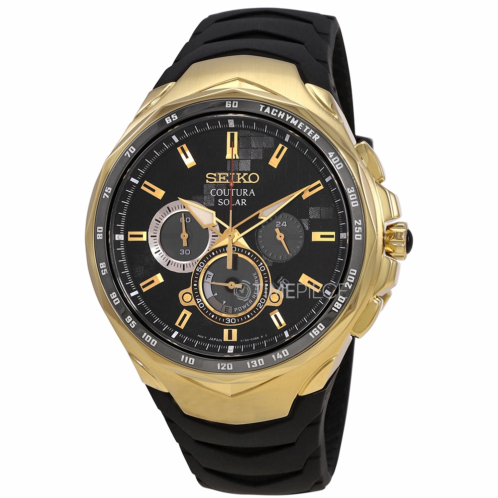 Gold-tone stainless steel case with a black silicone strap. Fixed gold-tone stainless steel bezel. Black dial with gold-tone hands and index hour markers. Minute markers around the outer rim. Dial Type: Analog. Luminescent hands and markers. Date display between 4 and 5 o'clock position. Chronograph - three sub-dials displaying: 60 second, 60 minute and 24 hour. Seiko Caliber V192 eco-drive movement. Scratch resistant sapphire crystal. Screw down crown. Solid case back. Round case shape, case size: 45.5 mm, case thickness: 12.3 mm. Tang clasp. Water resistant at 100 meters / 330 feet. Functions: chronograph, date, GMT, second time zone, hour, minute, small second, power reserve indicator, solar-powered. Coutura Series. Sport watch style. Watch label: Japan Movt. Seiko Coutura Chronograph Solar Black Dial Mens Watch SSC810P9.