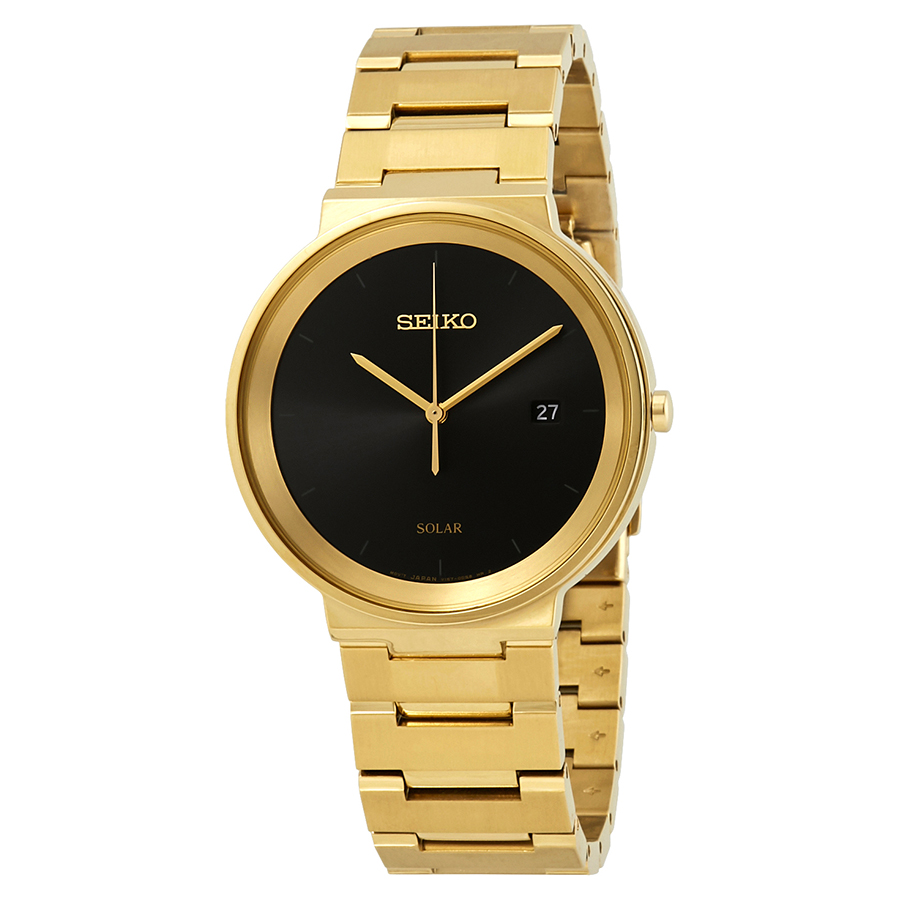 Yellow gold-tone stainless steel case with a yellow gold-tone stainless steel bracelet. Fixed yellow gold-tone stainless steel bezel. Black dial with yellow gold-tone hands and index hour markers. Dial Type: Analog. Date display at the 3 o'clock position. Seiko Caliber V157 eco-drive movement with a 10-months power reserve. Scratch resistant hardlex crystal. Pull / push crown. Solid case back. Round case shape, case size: 40 mm, case thickness: 9 mm. Band width: 20 mm. Fold over clasp. Water resistant at 30 meters / 100 feet. Functions: date, hour, minute, second, solar-powered. Additional Info: in general, withstands splashes or brief immersion in water, but not suitable for swimming or bathing. Casual watch style. Watch label: Japan Movt. Seiko Essentials Black Dial Yellow Gold-tone Mens Watch SNE482.