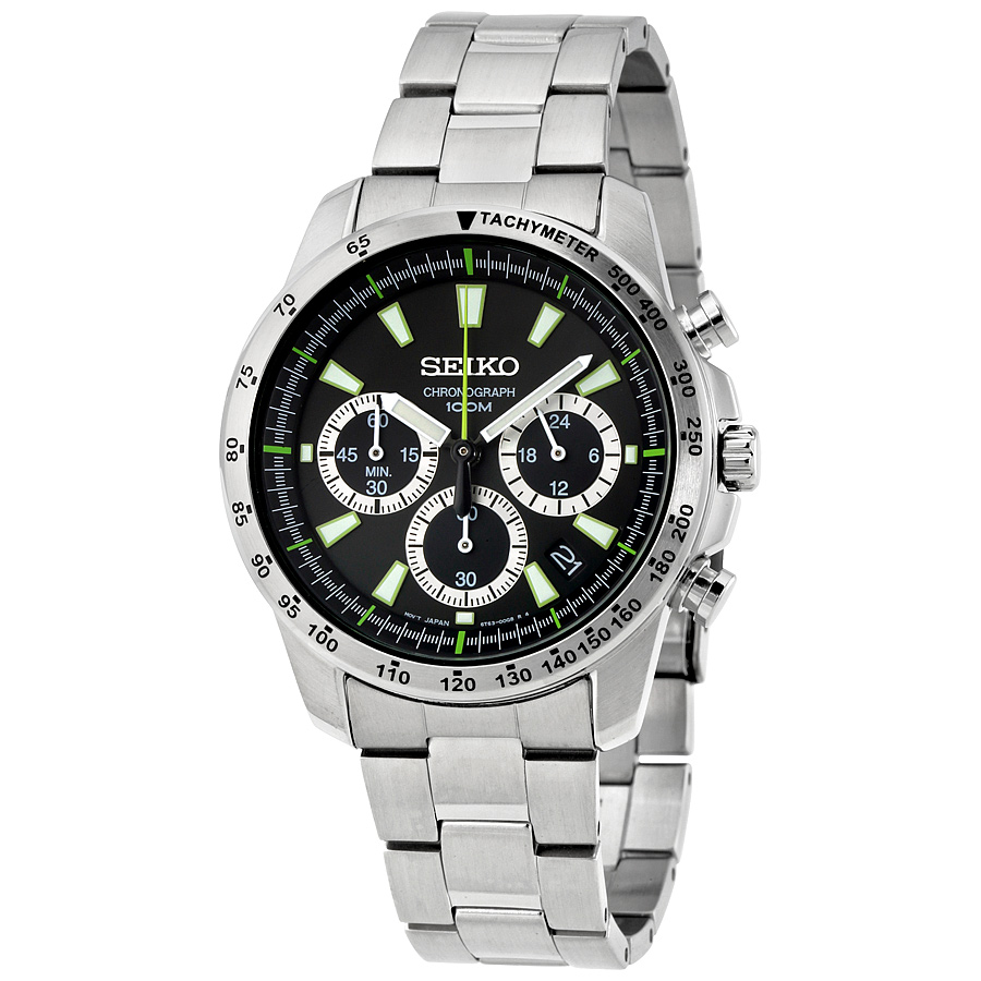 Stainless steel case with a stainless steel bracelet. Fixed stainless steel bezel showing tachymeter markings. Black dial with luminous silver-tone hands and index hour markers. Minute markers around the outer rim. Dial Type: Analog. Luminescent hands and markers. Date display between the 4 and 5 o'clock positions. Chronograph - three sub-dials displaying: 60 second, 60 minute and 24 hour. Seiko Caliber 6T63 quartz movement. Scratch resistant Hardlex crystal. Pull / push crown. Solid case back. Round case shape. Case size: 40 mm. Case thickness: 11 mm. Band width: 20 mm. Fold over clasp. Water resistant at 100 meters / 330 feet. Functions: chronograph, tachymeter, date, hour, minute, second. Additional Info: suitable for snorkeling, as well as swimming, but not diving. Casual watch style. Watch label: Japan Movt. Seiko Chronograph Black Dial Stainless Steel Mens Watch SSB027.
