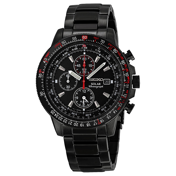 Black ion-plated stainless steel case and bracelet. Unidirectional black ion-plated bezel with slide-rule. Black dial with silver-tone hands and index hour markers. Minute markers. Tachymeter around the outer rim. Dial Type: Analog. Luminescent hands and markers. Date display at the 3 o'clock position. Chronograph - three sub-dials displaying: 60 second, 60 minute and 24 hour (alarm). Quartz movement. Scratch resistant Hardlex crystal. Screw down crown. Solid case back. Case diameter: 44 mm. Case thickness: 12 mm. Round case shape. Band width: 20 mm. Push button clasp. Water resistant at 100 meters / 330 feet. Functions: chronograph, date, hour, minute, second. Casual watch style. Seiko Chronograph All Black Mens Watch SSC145.