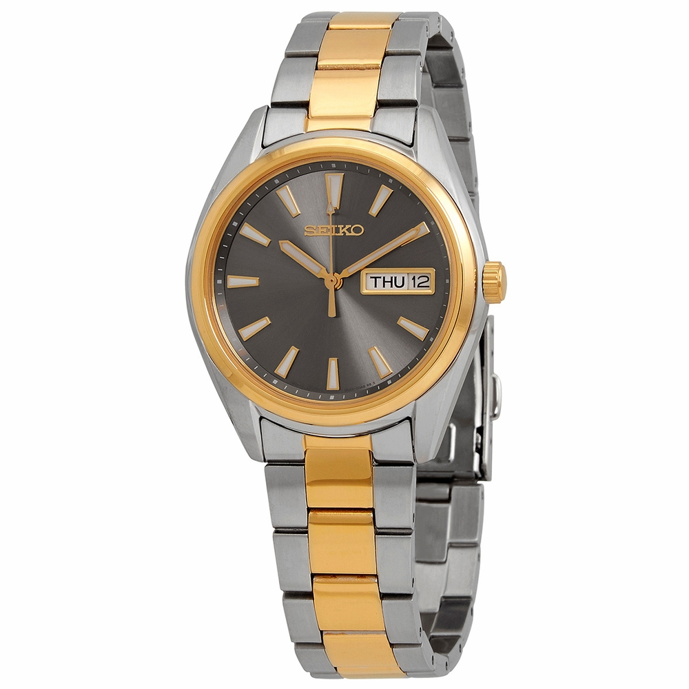 Stainless steel case with a two tone (silver-tone and yellow gold-tone) stainless steel bracelet. Fixed yellow gold--tone bezel. Grey dial with luminous yellow gold-tone index-style hands and index hour markers. Minute markers around the outer rim. Dial Type: Analog. Luminescent hands and markers. Day of the week and date display at the 3 o'clock position. Seiko Caliber 6N43 quartz movement. Scratch resistant Hardlex crystal. Pull / push crown. Solid case back. Round case shape. Case size: 36 mm. Case thickness: 9 mm. Band width: 20 mm. Deployment clasp with a push button release. Water resistant at 100 meters / 330 feet. Functions: date, day, hour, minute, second. Neo Classic Series. Casual watch style. Seiko Neo classic Quartz Grey Dial Watch SUR348P1.