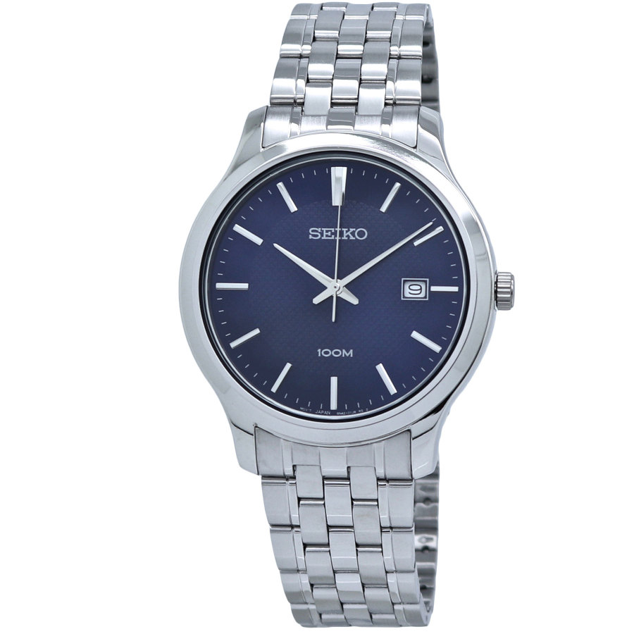 Stainless steel case with a stainless steel bracelet. Fixed stainless steel bezel. Blue dial with silver-tone hands and index hour markers. Minute markers around the outer rim. Dial Type: Analog. Date display at the 3 o'clock position. Quartz movement. Scratch resistant Hardlex crystal. Pull / push crown. Solid case back. Round case shape. Case size: 41 mm. Case thickness: 9 mm. Band width: 20 mm. Fold over clasp with a safety release. Water resistant at 100 meters / 330 feet. Functions: date, hour, minute, second. Neo Classic Series. Casual watch style. Watch label: Japan Movt. Seiko Neo Classic Quartz Blue Dial Mens Watch SUR291P1.