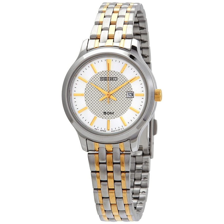 Stainless steel case with a two-tone (silver-tone and gold-tone) stainless steel bracelet. Fixed stainless steel bezel. White patterned dial with gold-tone hands and index hour markers. Minute markers around the outer rim. Dial Type: Analog. Date display at the 3 o'clock position. Seiko caliber 6N22 quartz movement. Scratch resistant Hardlex crystal. Pull / push crown. Solid case back. Round case shape. Case size: 30 mm. Case thickness: 7 mm. Band width: 14 mm. Fold over clasp with a push button release. Water resistant at 50 meters / 165 feet. Functions: date, hour, minute, second. Casual watch style. Watch label: Japan Movt. Seiko Neo Classic Quartz White Dial Two-tone Ladies Watch SUR647P1.
