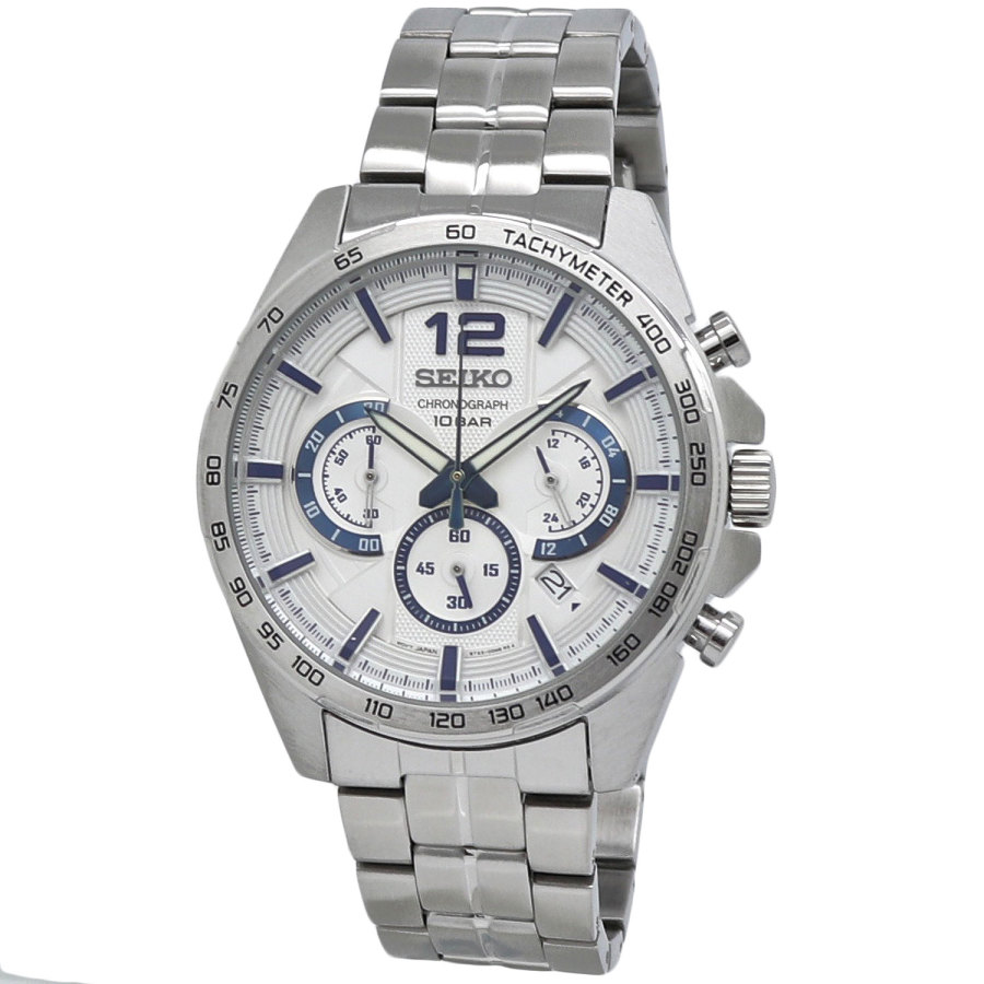 Stainless steel case with a stainless steel bracelet. Fixed stainless steel bezel showing tachymeter markings. White dial with luminous blue hands and index hour markers. Minute markers around the outer rim. Dial Type: Analog. Luminescent hands and markers. Date display between the 4 and 5 o'clock positions. Seiko caliber 8T63 quartz movement. Scratch resistant Hardlex crystal. Solid case back. Round case shape. Case size: 43.9 mm. Case thickness: 12.9 mm. Band width: 22 mm. Fold over clasp. Water resistant at 100 meters / 330 feet. Functions: chronograph, tachymeter, date, hour, minute, second. Sport watch style. Watch label: Japan Movt. Seiko Conceptual Chronograph Quartz White Dial Mens Watch SSB343P1.