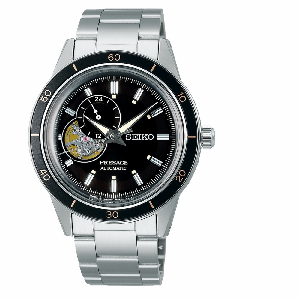 Silver-tone stainless steel case and bracelet. Fixed black stainless steel bezel. Black dial with black hands and index hour markers. Minute markers around the outer rim. Dial Type: Analog. Luminescent hands and markers. One subdial displaying: 24 hour. Seiko Caliber 4R39 Automatic movement, containing 24 Jewels, bitting at 21600 vph, and has a power reserve of approximately 41 hours. Scratch resistant Hardlex crystal. Pull / push crown. Transparent case back. Round case shape, case size: 40.8 mm, case thickness: 12.8 mm. Band width: 20 mm. Fold over clasp with a safety release. Water resistant at 50 meters / 165 feet. Functions: GMT, second time zone, hour, minute, second. Presage Series. Sport watch style. Watch label: Japan Movt. Seiko Presage Automatic Black Dial Mens Watch SSA425J1.