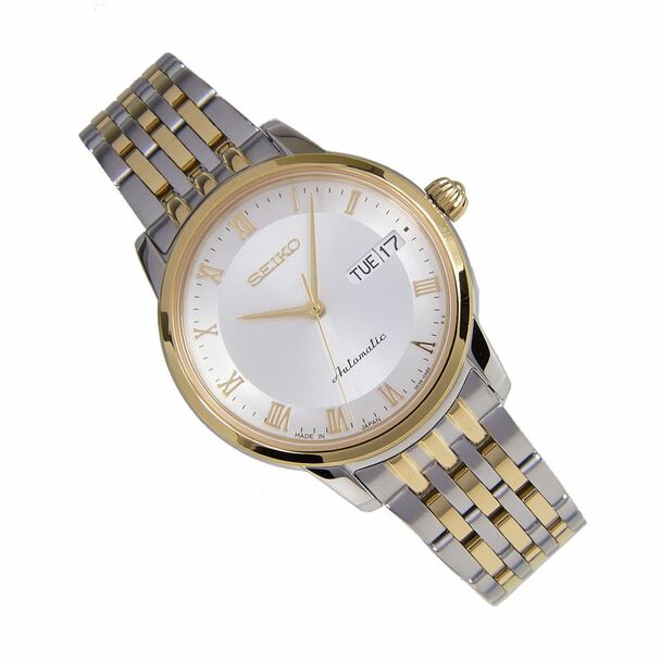 Stainless steel case with a two-tone (silver and gold-plated) stainless steel bracelet. Fixed gold-plated bezel. Silver dial with gold-tone hands and Roman numeral hour markers. Minute markers around the outer rim. Dial Type: Analog. Day of the week and date display at the 3 o'clock position. Automatic movement with a 41-hour power reserve. Scratch resistant sapphire crystal. Pull / push crown. Transparent case back. Round case shape. Case size: 38 mm. Band width: 20 mm. Fold over clasp with a push button release. Water resistant at 100 meters / 330 feet. Functions: date, day, hour, minute, second. Presage Series. Casual watch style. Watch label: Japan Movt. Seiko Presage Automatic Silver Dial Ladies Watch SRP884J1.
