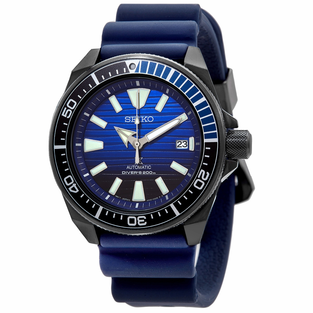 Black-plated stainless steel case with a blue silicone strap. Uni-directional rotating black-plated bezel with a black and blue ring. Blue dial with silver-tone hands and index hour markers. Minute markers around the outer rim. Dial Type: Analog. Luminescent hands and markers. Date display at the 3 o'clock position. Seiko Caliber 4R35 Automatic movement, containing 23 Jewels, bitting at 21600 vph, and has a power reserve of approximately 41 hours. Scratch resistant Hardlex crystal. Screw down crown. Solid case back. Round case shape. Case size: 43.8 mm. Case thickness: 12.8 mm. Band width: 22 mm. Tang clasp. Water resistant at 200 meters / 660 feet. Functions: date, hour, minute, second. Prospex Series. Watch label: Japan Made. Seiko Prospex Automatic Blue Dial Mens Watch SRPD09K1.