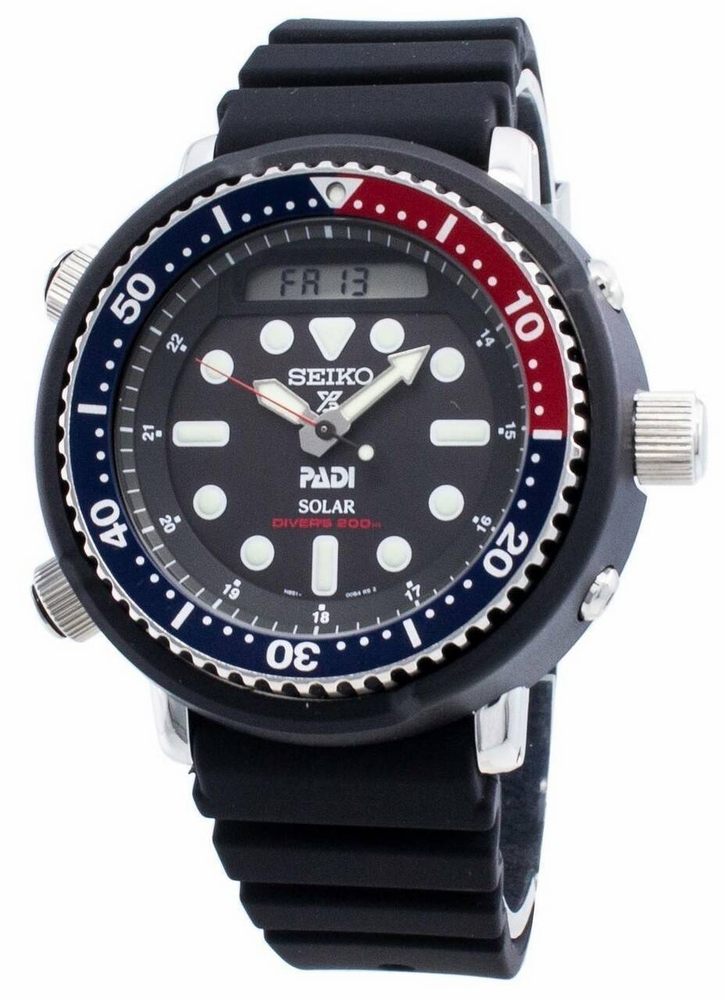 Black-plated stainless steel case with a black silicone strap. Uni-directional rotating black-plated bezel with an inlaid red and blue ring. Black dial with luminous silver-tone hands and dot hour markers. Minute markers around the outer rim. Dial Type: Analog-digital. Luminescent led. Chronograph - sub-dials displaying: digital. Eco-drive movement. Scratch resistant Hardlex crystal. Screw down crown. Solid case back. Round case shape. Case size: 47.5 mm. Case thickness: 15 mm. Band width: 22 mm. Tang clasp. Water resistant at 200 meters / 660 feet. Functions: hour, minute, second, chronograph, full-auto calendar, power save function. Prospex Series. Sport watch style. Seiko Prospex Analog-Digital Black Dial Mens Watch SNJ027P1.
