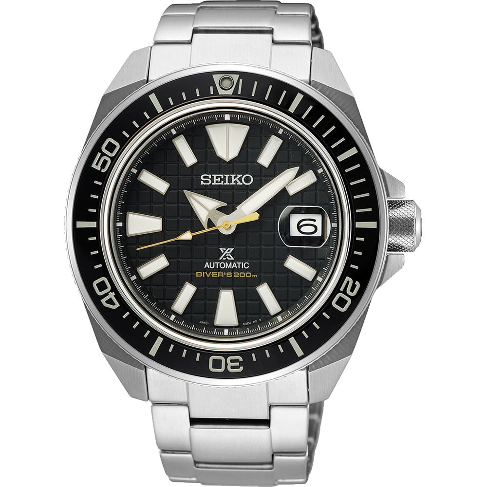 Silver-tone stainless steel case and bracelet. Uni-directional rotating black bezel. Blue gradient dial with luminous silver-tone hands and index hour markers. Minute markers around the outer rim. Dial Type: Analog. Luminescent hands and markers. Date display at the 3 o'clock position. Caliber 4R35 automatic movement with a 41-hour power reserve. Scratch resistant sapphire crystal. Screw down crown. Screw down case back. Round case shape, case size: 43.8 mm, case thickness: 14 mm. Band width: 22 mm. Deployment with push button release clasp. Water resistant at 200 meters / 660 feet. Functions: date, hour, minute, second. Prospex Divers Series. Casual watch style. Seiko Prospex Blue "Manta Ray" Dial Automatic Mens Watch SRPE33.