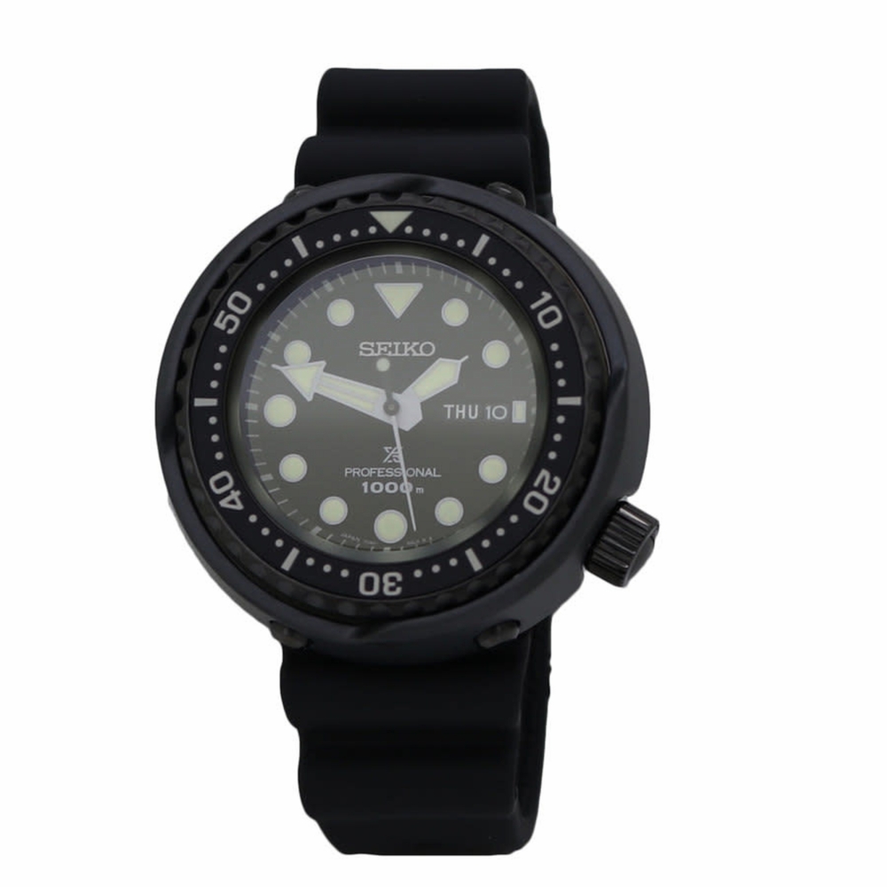 Black titanium, ceramic case with a black silicone strap. Uni-directional rotating black bezel. Black dial with silver-tone hands and dots hour markers. Minute markers around the outer rim. Dial Type: Analog. Luminescent hands and markers. Day & date display at the 3 o'clock position. Seiko Caliber 7C46 quartz movement. Scratch resistant sapphire crystal. Screw down crown. Round case shape, case size: 49.4 mm, case thickness: 16.3 mm. Buckle clasp. Water resistant at 1000 meters / 3300 feet. Functions: date, day, hour, minute, second. Prospex Series. Dress watch style. Watch label: Japan Movt. Seiko Prospex Quartz Black Dial Mens Watch S23631J1.
