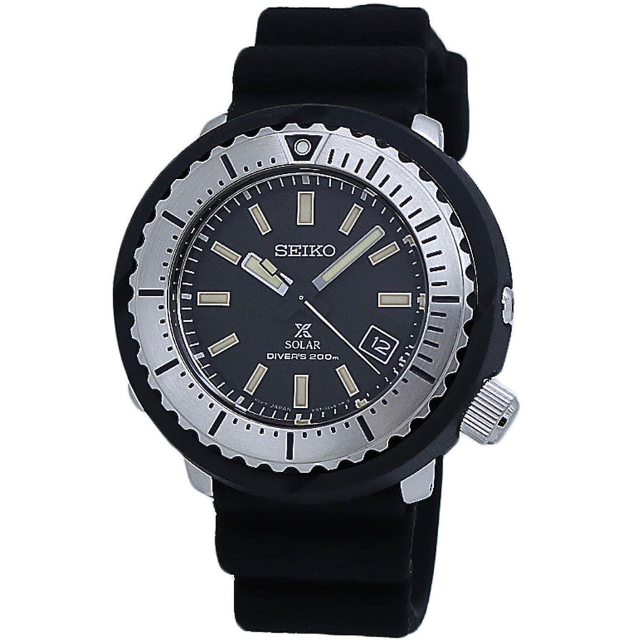 Black stainless steel case with a black silicone strap. Uni-directional rotating white stainless steel bezel. Black dial with luminous silver-tone hands and index hour markers. Minute markers around the outer rim. Dial Type: Analog. Luminescent hands and markers. Date display at the 4 o'clock position. Seiko Caliber V157 eco-drive movement. Scratch resistant hardlex crystal. Screw down crown. Solid case back. Round case shape, case size: 46.7 mm, case thickness: 12 mm. Band width: 22 mm. Buckle clasp. Water resistant at 200 meters / 660 feet. Functions: date, hour, minute, second, solar-powered. Dive watch style. Watch label: Japan Movt. Seiko Prospex Black Dial Mens Watch SNE541P1.