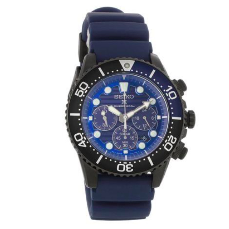 Black stainless steel case with a blue silicone strap. Uni-directional rotating blue stainless steel bezel. Blue dial with gold-tone hands and dot hour markers. Minute markers around the outer rim. Dial Type: Analog. Luminescent hands and markers. Between the 4 and 5 o'clock position. Chronograph - three sub-dials displaying: 60 minutes, 60 minutes, and 24 hours. Seiko caliber V175 quartz movement. Scratch resistant Hardlex crystal. Screw down crown. Solid case back. Round case shape. Case size: 43.5 mm. Case thickness: 12 mm. Strap width: 22 mm. Tang clasp. Water resistant at 200 meters / 660 feet. Functions: chronograph, date, GMT, second time zone, hour, minute, second, solar-powered. Sport watch style. Watch label: Japan Movt. Seiko Prospex Solar Blue Dial Mens Watch SSC701.
