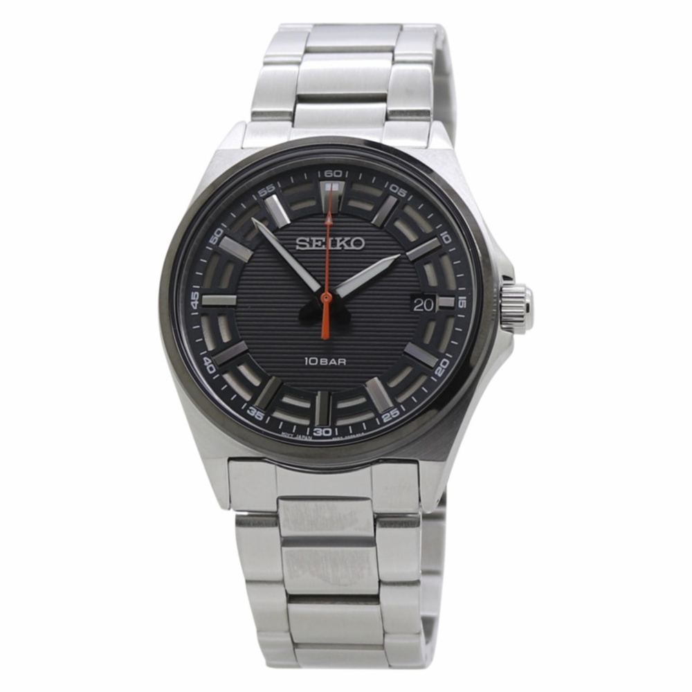 Stainless steel case with a stainless steel bracelet. Fixed black-plated bezel. Black dial with luminous silver-tone hands and index hour markers. Arabic numeral minute markers (at 5 minute intervals). Minute markers around the outer rim. Dial Type: Analog. Luminescent hands and markers. Date display at the 3 o'clock position. Seiko caliber 6N52 quartz movement. Scratch resistant Hardlex crystal. Pull / push crown. Solid case back. Round case shape. Case size: 40 mm. Case thickness: 9.8 mm. Band width: 20 mm. Fold over clasp with a safety release. Water resistant at 100 meters / 330 feet. Functions: date, hour, minute, second. Sport watch style. Watch label: Japan Movt. Seiko Quartz Crystal Black Dial Mens Watch SUR507P1.