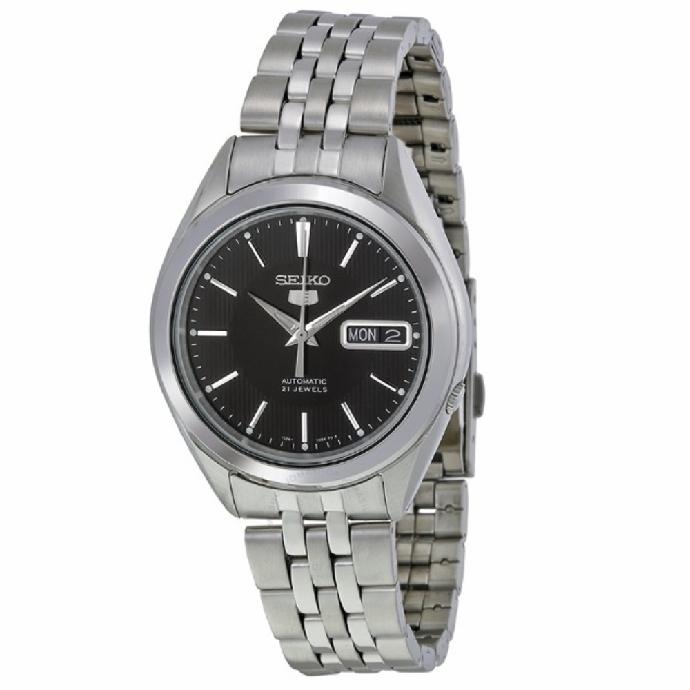 Stainless steel case with a stainless steel bracelet. Fixed stainless steel bezel. Black dial with luminous silver-tone hands and index hour markers. Minute markers around the outer rim. Dial Type: Analog. Luminescent hands and markers. Day of the week and date display at the 3 o'clock position. Seiko caliber 7S26 automatic movement, based upon Seiko 7002, containing 21 Jewels, bitting at 21600 vph, and has a power reserve of approximately 40 hours. Scratch resistant Hardlex crystal. Pull / push crown. Transparent case back. Round case shape. Case size: 38 mm. Case thickness: 10.5 mm. Deployment clasp. Water resistant at 30 meters / 100 feet. Functions: date, day, hour, minute, second. Seiko 5 Series. Casual watch style. Watch label: Japan Movt. Seiko Seiko 5 Automatic Black Dial Mens Watch SNKL23K1.