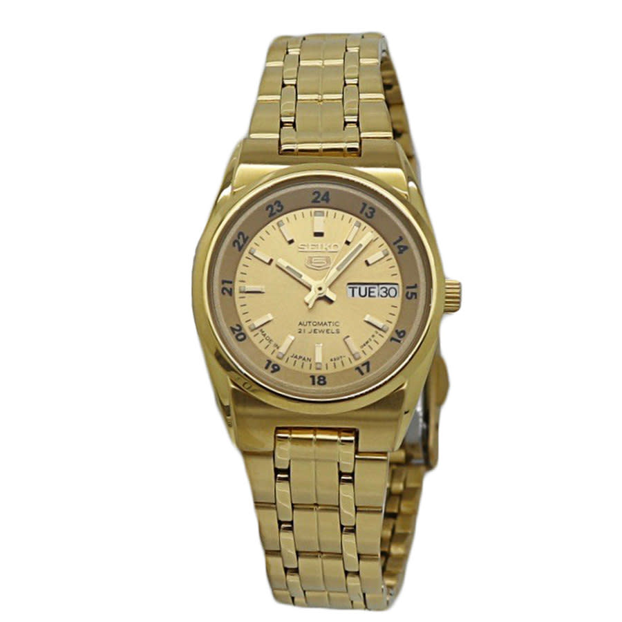 Yellow gold-tone stainless steel case and bracelet. Fixed yellow gold-tone stainless steel bezel. Champagne dial with luminous yellow gold-tone hands and index hour markers. Minute markers. 24 hour markers around the outer rim. Dial Type: Analog. Luminescent hands and markers. Day/date display at the 3 o'clock position. Seiko Caliber 4207 Automatic movement, containing 21 Jewels, bitting at 21600 vph, and has a power reserve of approximately 24 hours. Scratch resistant Hardlex crystal. Pull / push crown. Solid case back. Round case shape, case size: 25 mm, case thickness: 10 mm. Band width: 14 mm. Fold over clasp with a push button release. Water resistant at 30 meters / 100 feet. Functions: date, day, hour, minute, second. Seiko 5 Series. Casual watch style. Watch label: Japan Movt. Seiko Seiko 5 Automatic Champagne Dial Ladies Watch SYMC04J1.