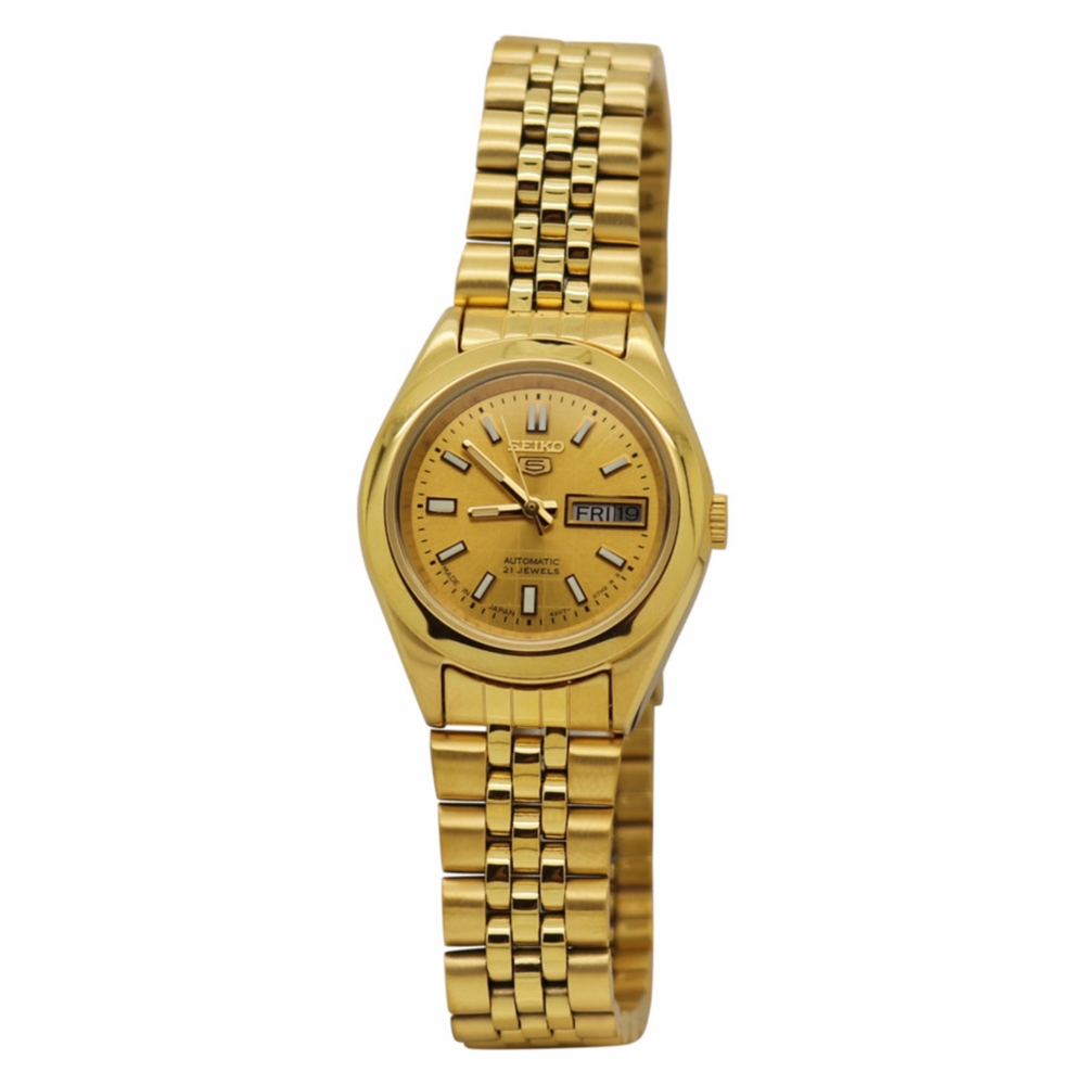 Yellow gold-tone stainless steel case and bracelet. Fixed yellow gold-tone stainless steel bezel. Gold-tone dial with yellow gold-tone hands and index hour markers. Minute markers around the outer rim. Dial Type: Analog. Luminescent hands and markers. Day of the week and date display at the 3 o'clock position. Automatic movement. Scratch resistant Hardlex crystal. Pull / push crown. Round case shape, case size: 25 mm, case thickness: 10 mm. Band width: 12 mm. Fold over with double push button release clasp. Water resistant at 30 meters / 100 feet. Functions: date, day, hour, minute, second. Seiko 5 Series. Casual watch style. Watch label: Japan Movt. Seiko Seiko 5 Automatic Gold Dial Ladies Watch SYMH58J1.