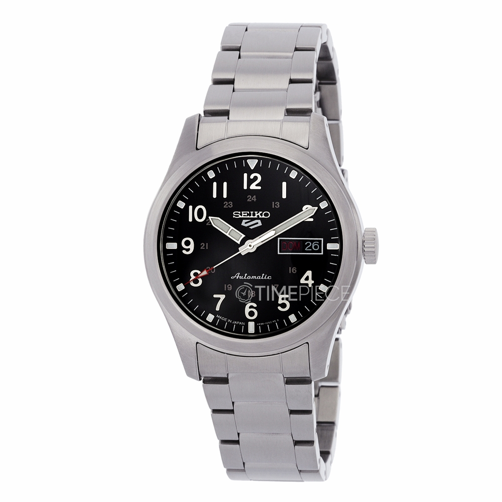 Silver-tone stainless steel case and bracelet. Fixed silver-tone stainless steel bezel. Black dial with silver-tone hands and Arabic numeral hour markers. Minute markers around the outer rim. Dial Type: Analog. Luminescent hands and markers. Day of the week and date display at the 3 o'clock position. Seiko Caliber 4R36 Automatic movement, containing 24 Jewels, bitting at 21600 vph, and has a power reserve of approximately 41 hours. Transparent see through case back. Round case shape, case size: 39.4 mm. Fold over clasp with a safety release. Water resistant at 100 meters / 330 feet. Functions: date, day, hour, minute, second. 5 Sports Series. Casual watch style. Watch label: Japan Movt. Seiko 5 Sports Automatic Black Dial Mens Watch SRPG27.