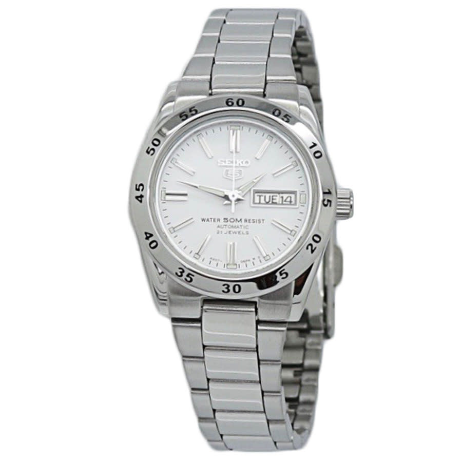 Silver-tone stainless steel case and bracelet. Fixed silver-tone stainless steel bezel. White dial with silver-tone dauphine-style shape hands and index hour markers. Minute markers around the outer rim. Dial Type: Analog. Luminescent hands and markers. Day/date display at the 3 o'clock position. Seiko Caliber 4207 Automatic movement, containing 21 Jewels, bitting at 21600 vph, and has a power reserve of approximately 24 hours. Scratch resistant Hardlex crystal. Pull / push crown. Solid case back. Round case shape, case size: 26 mm, case thickness: 10 mm. Band width: 14 mm. Fold over clasp with a push button release. Water resistant at 50 meters / 165 feet. Functions: date, day, hour, minute, second. Seiko 5 Series. Casual watch style. Watch label: Japan Movt. Seiko Seiko 5 Automatic White Dial Ladies Watch SYMG35.