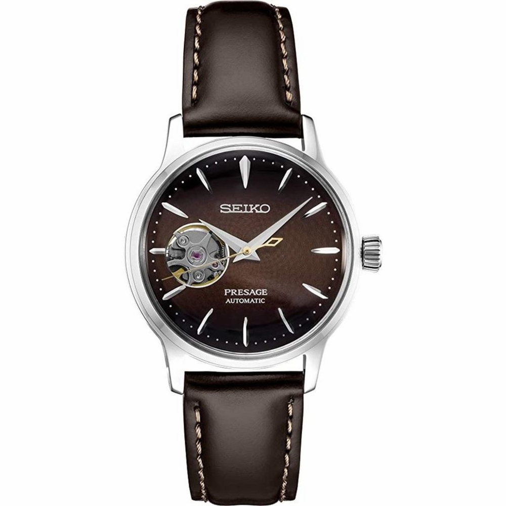 Silver-tone stainless steel case with a brown leather strap. Fixed silver-tone stainless steel bezel. Brown dial with silver-tone hands and index hour markers. Minute markers around the outer rim. Dial Type: Analog. Seiko Caliber 4R38 Automatic movement, containing 24 Jewels, bitting at 21600 vph, and has a power reserve of approximately 41 hours. Round case shape, case size: 33.8 mm. Deployment with push button release clasp. Water resistant at 50 meters / 165 feet. Functions: hour, minute, second. Presage Series. Casual watch style. Watch label: Japan Movt. Seiko Presage Automatic Brown Dial Ladies Watch SSA783.