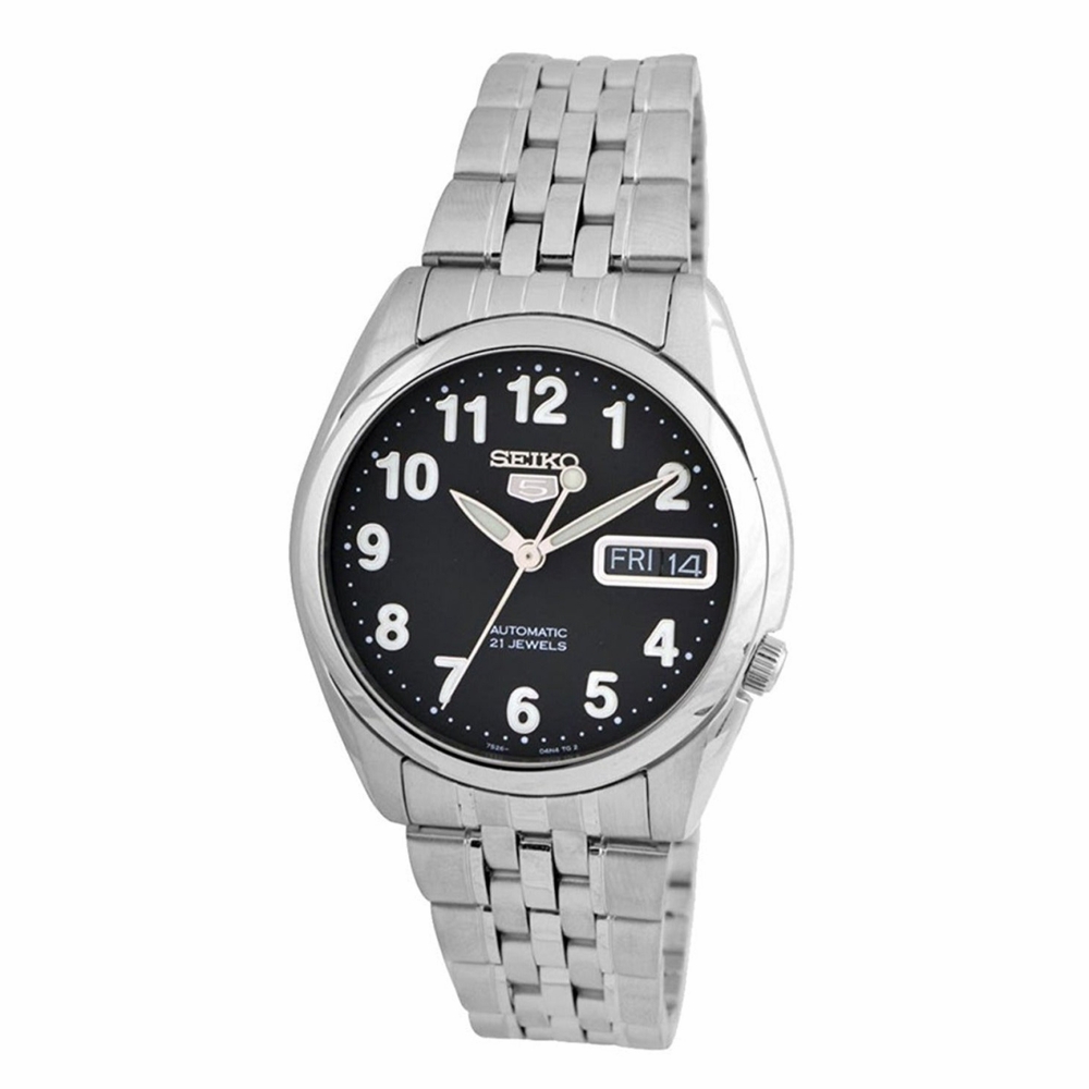 Silver-tone stainless steel case and bracelet. Fixed silver-tone stainless steel bezel. Black dial with silver-tone hands and Arabic numeral hour markers. Minute markers around the outer rim. Dial Type: Analog. Luminescent hands and markers. Day of the week and date display at the 3 o'clock position. Seiko Caliber 7S26 Automatic movement, based upon Seiko 7002, containing 21 Jewels, bitting at 21600 vph, and has a power reserve of approximately 40 hours. Scratch resistant Hardlex crystal. Pull / push crown. Transparent case back. Round case shape, case size: 38 mm, case thickness: 11 mm. Band width: 17 mm. Fold over clasp with a push button release. Water resistant at 30 meters / 100 feet. Functions: date, day, hour, minute, second. Series 5 Series. Casual watch style. Seiko Series 5 Automatic Black Dial Mens Watch SNK381K1.