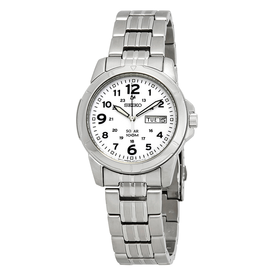 Silver-tone stainless steel case with a silver-tone stainless steel bracelet. Fixed silver-tone stainless steel bezel. White dial with luminous silver-tone hands and Arabic numeral hour markers. 24 hour markers. minute markers around the outer rim. Dial Type: Analog. Luminescent hands and markers. Day of the week and date display at the 3 o'clock position. Quartz movement. Scratch resistant hardlex crystal. Pull / push crown. Solid case back. Round case shape, case size: 40 mm, case thickness: 10 mm. Band width: 20 mm. Water resistant at 100 meters / 330 feet. Functions: date, day, hour, minute, second. Casual watch style. Seiko Solar White Dial Stainless Steel Mens Watch SNE503.