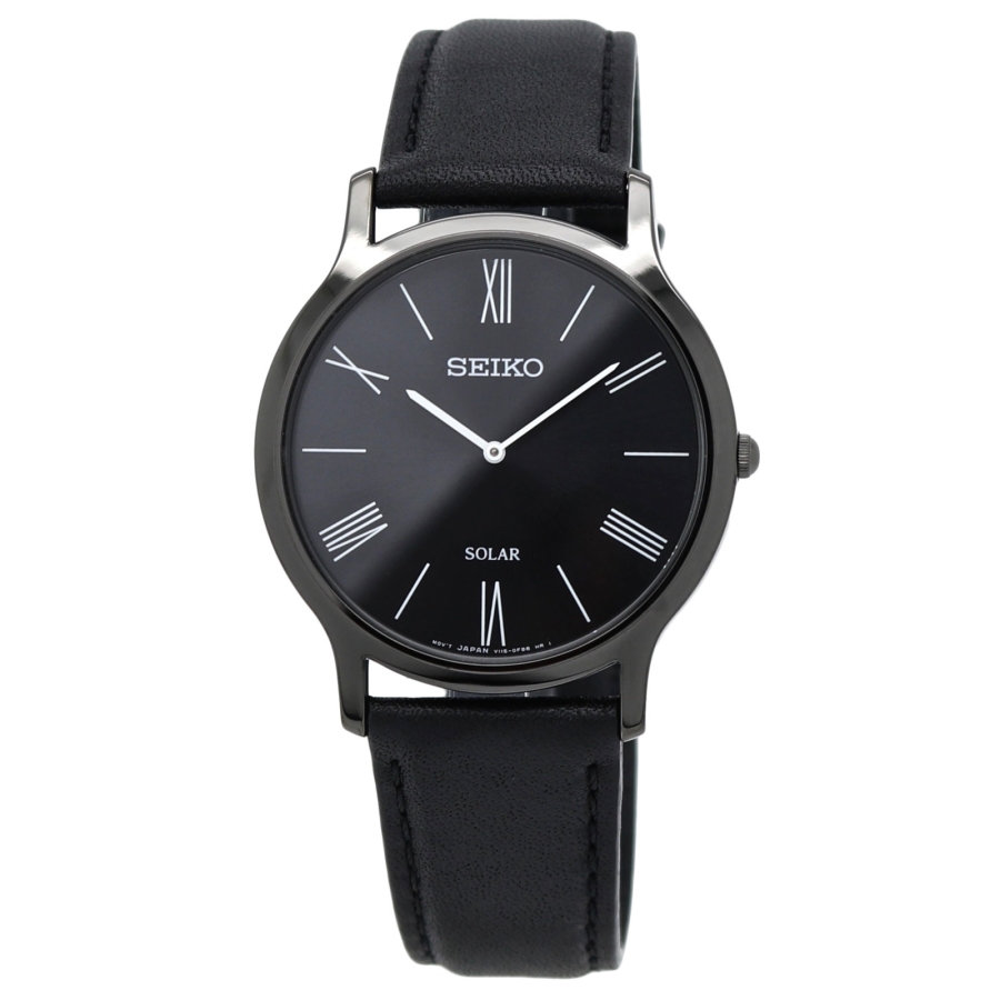 Black ion-plated stainless steel case with a black leather strap. Fixed black ion-plated bezel. Black dial with silver-tone hands and alternating Roman numeral & index hour markers. Dial Type: Analog. V115 quartz movement. Scratch resistant Hardlex crystal. Pull / push crown. Solid case back. Round case shape.Case size: 38 mm. Case thickness: 7 mm. Band width: 20 mm. Tang clasp. Water resistant at 30 meters / 100 feet. Functions: hour, minute. Casual watch style. Watch label: Japan Movt. Seiko Solar Black Dial Black Leather Mens Watch SUP855.