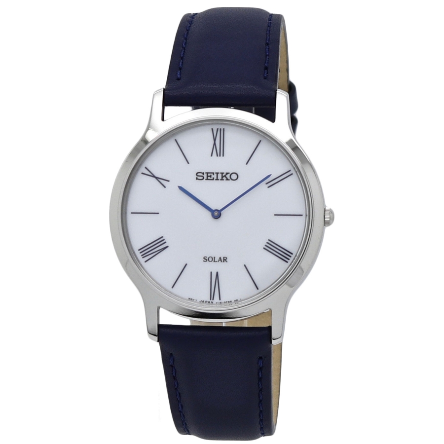 Stainless steel case with a blue leather strap. Fixed stainless steel bezel. White dial with blue hands and alternating Roman numeral and index hour markers. Dial Type: Analog. Seiko caliber V115 quartz movement. Scratch resistant Hardlex crystal. Pull / push crown. Solid case back. Round case shape. Cse size: 38 mm. Case thickness: 7 mm. Band width: 20 mm. Tang clasp. Water resistant at 30 meters / 100 feet. Functions: hour, minute, solar-powered. Solar Series. Casual watch style. Watch label: Japan Movt. Seiko Solar Quartz White Dial Mens Watch SUP857.