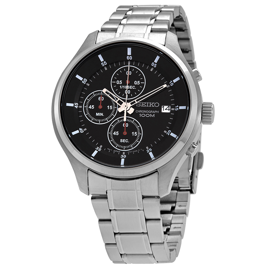 Stainless steel case with a stainless steel bracelet. Fixed stainless steel bezel. Black dial with silver-tone skeleton hands and index hour markers. Minute markers around an inner ring. Dial Type: Analog. Date display at the 3 o'clock position. Chronograph - three sub-dials displaying: 60 second, 60 minute and 1/10 second. Seiko caliber 4T57 quartz movement. Scratch resistant Hardlex crystal. Solid case back. Round case shape. Case size: 43 mm. Case thickness: 12 mm. Band width: 20 mm. Fold over clasp. Water resistant at 100 meters / 330 feet. Functions: chronograph, date, hour, minute, second. Tactical Series. Sport watch style. Watch label: Japan Movt. Seiko Tactical Chronograph Quartz Black Dial Watch SKS539P1.