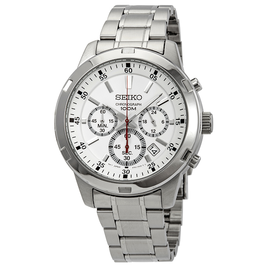 Stainless steel case with a stainless steel bracelet. Fixed stainless steel bezel. Silver dial with luminous silver-tone hands and index hour markers. Minute markers around the outer rim. Dial Type: Analog. Luminescent hands and markers. Date display between the 4 and 5 o'clock positions. Chronograph - three sub-dials displaying: 60 second, 60 minute and 24 hour. Seiko caliber 4T53 quartz movement. Scratch resistant Hardlex crystal. Solid case back. Round case shape. Case size: 43 mm. Case thickness: 12 mm. Band width: 20 mm. Deployment clasp. Water resistant at 100 meters / 330 feet. Functions: chronograph, date, GMT, second time zone, hour, minute, second. Sport watch style. Watch label: Japan Movt. Seiko Neo Sports Chronograph Silver Dial Mens Watch SKS601P1.