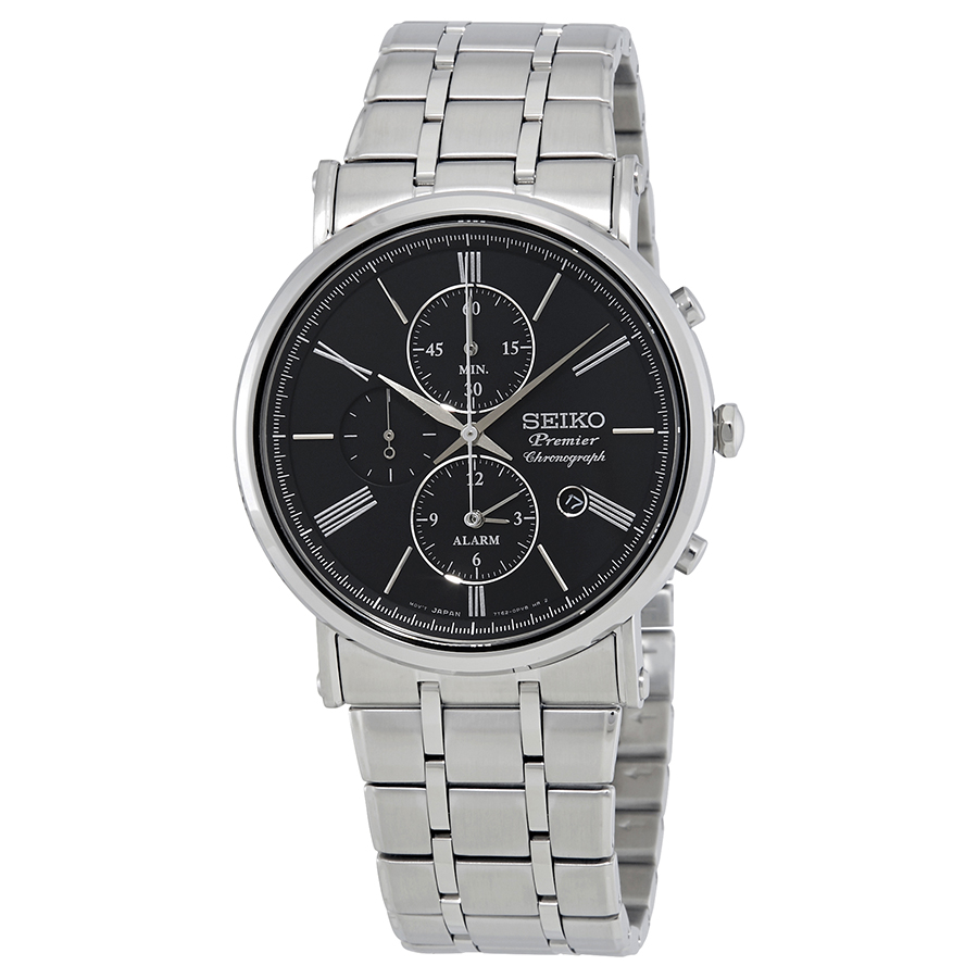 Stainless steel case with a stainless steel bracelet. Fixed stainless steel bezel. Black dial with silver-tone hands and Roman numeral hour markers. Minute markers around the outer rim. Dial Type: Analog. Date display between the 4 and 5 o'clock positions. Chronograph - three sub-dials displaying: 60 second, 60 minute and 12 hour (alarm). Seiko Caliber 7T62 quartz movement. Scratch resistant sapphire crystal. Solid case back. Round case shape, case size: 41 mm, case thickness: 10 mm. Band width: 22 mm. Fold over clasp with a push button release. Water resistant at 100 meters / 330 feet. Functions: chronograph, alarm, date, hour, minute, small second. Sport watch style. Watch label: Japan Movt. Seiko Premier Alarm Chronograph Black Dial Mens Watch SNAF75P1.