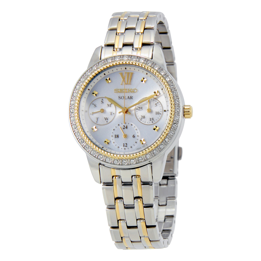 Stainless steel case with a two-tone (silver and gold-tone) stainless steel bracelet. Fixed two-tone bezel set with Swarovski crystals. Silver dial with gold-tone hands and index hour markers. A Roman numeral marks the 12 o'clock position. Minute markers around the outer rim. Dial Type: Analog. Date display at the 3 o'clock position. Three multi-function sub-dials displaying: date, day of the week, 24 hours. Seiko caliber V14J quartz movement. Scratch resistant Hardlex crystal. Solid case back. Case size: 32 mm. Case thickness: 10 mm. Round case shape. Deployment clasp with a push button release. Water resistant at 30 meters / 100 feet. Functions: date, day, hour, minute, second. Additional Info: in general, withstands splashes or brief immersion in water, but not suitable for swimming. Casual watch style. Seiko Recraft Multi-Function Silver Dial Ladies Watch SNE874.