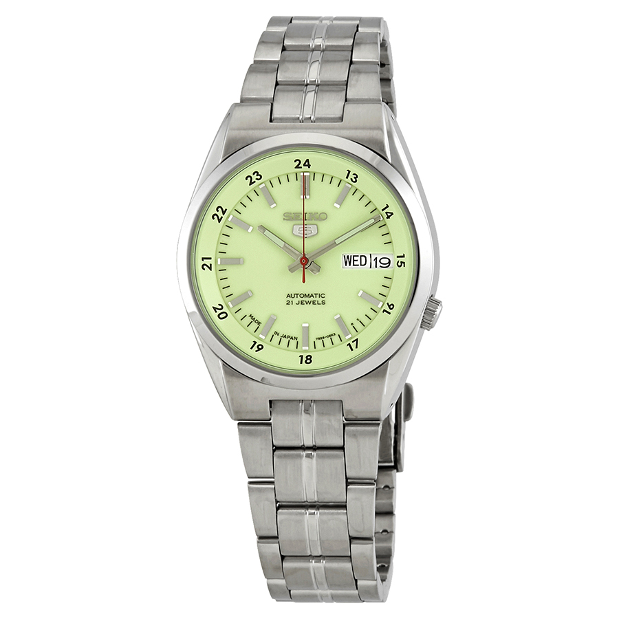 Silver-tone stainless steel case with a silver-tone stainless steel bracelet. Fixed silver-tone bezel. Green dial with silver-tone hands and index hour markers. Minute markers around the outer rim. Dial Type: Analog. Luminescent hands and markers. Day of the week and date display at the o'clock position. Seiko Caliber 7S26 automatic movement with a 40-hour power reserve. Scratch resistant hardlex crystal. Round case shape, case size: 36 mm, case thickness: 11 mm. Band width: 20 mm. Deploymen clasp. Water resistant at 30 meters / 100 feet. Functions: date, day, hour, minute, second. Casual watch style. Watch label: Made in Japan. Seiko Series 5 Automatic Date-Day Green Dial Mens Watch SNK573J1.