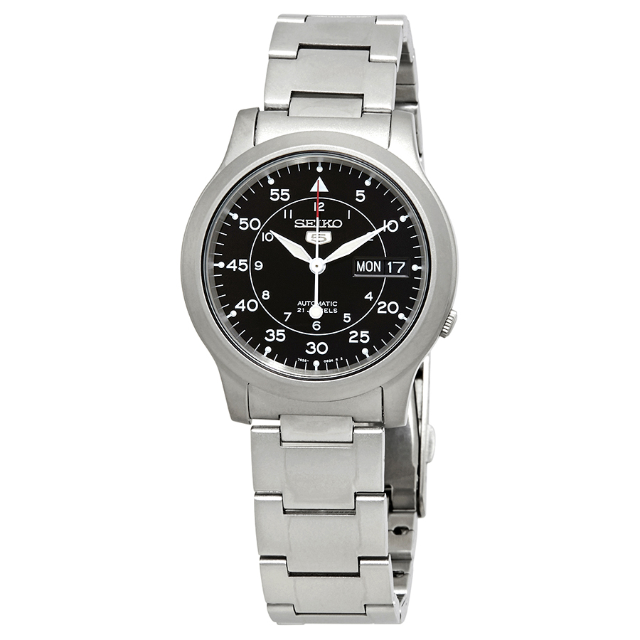 Stainless steel case with a stainless steel bracelet. Fixed stainless steel bezel. Black dial with luminous silver-tone hands and Arabic numeral hour markers. Arabic numeral minute markers (at 5 minute intervals). Minute markers around the outer rim. Dial Type: Analog. Luminescent hands and markers. Day of the week and date display at the 3 o'clock position. Seiko caliber 7S26C automatic movement with a 40 power reserve. Scratch resistant hardlex crystal. Pull / push crown. Transparent case back. Round case shape. Case size: 36 mm. Case thickness: 8 mm. Band width: 18 mm. Fold over clasp with a double push button release. Water resistant at 30 meters / 100 feet. Functions: date, day, hour, minute, second. Additional Info: withstands rain and splashes of water, but not showering or submersion. Casual watch style. Seiko Series 5 Automatic Black Dial Mens Watch SNK809K1.