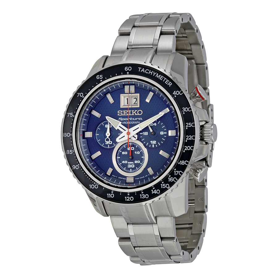 Stainless steel case with a stainless steel bracelet. Fixed stainless steel bezel with a black top ring showing tachymeter markings. Blue dial with luminous silver-tone hands and index hour markers. Minute markers around the outer rim. Dial Type: Analog. Luminescent hands and markers. Date display at the 12 o'clock position. Chronograph - three sub-dials displaying: 60 second, 60 minute and 24 hour. Quartz movement. Scratch resistant Hardlex crystal. Screw down crown. Case diameter: 44.5 mm. Case thickness: 12 mm. Round case shape. Band width: 21 mm. Deployment clasp. Water resistant at 100 meters / 330 feet. Functions: chronograph, tachymeter, date, hour, minute, second. Casual watch style. Seiko Sportura Chronograph Blue Dial Stainless Steel Mens Watch SPC135.