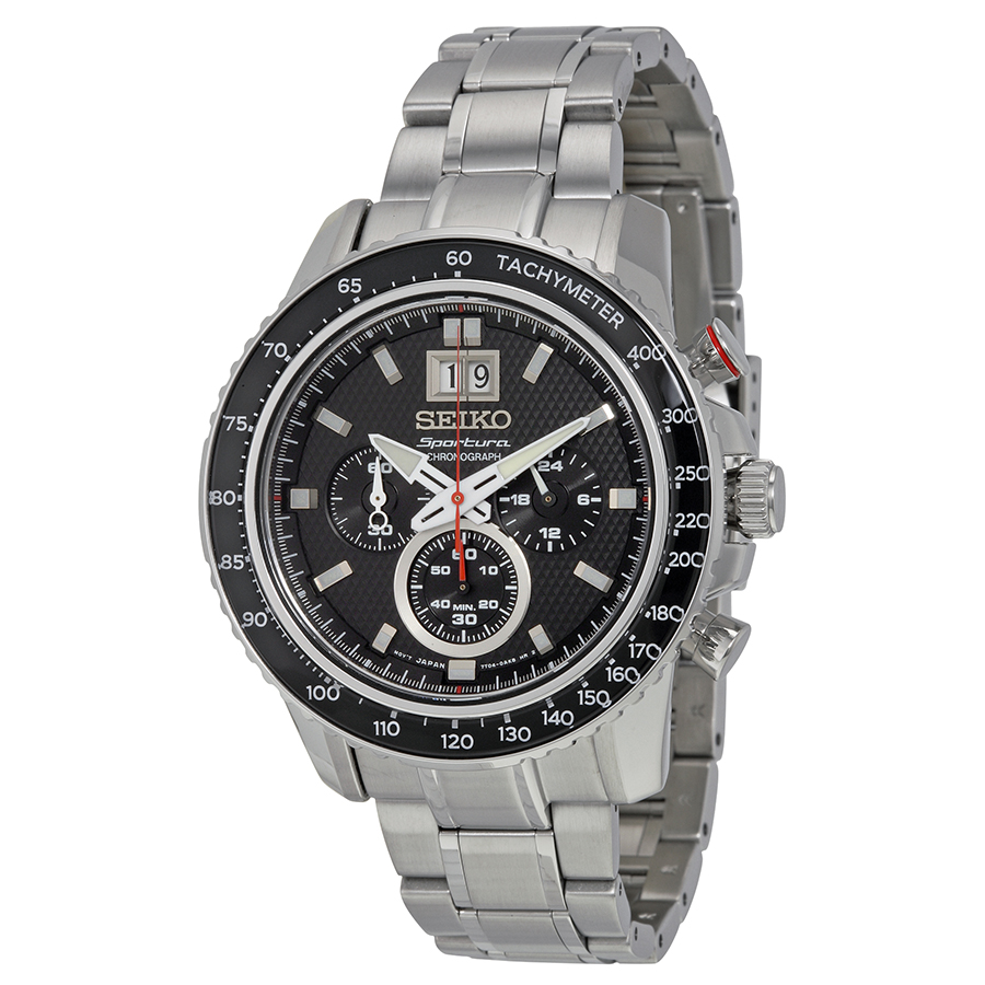 Stainless steel case with a stainless steel bracelet. Fixed stainless steel bezel with a black top ring showing tacymeter markings. Black dial with luminous silver-tone hands and index hour markers. Minute markers around the outer rim. Dial Type: Analog. Luminescent hands and markers. Date display at the 12 o'clock position. Chronograph - three sub-dials displaying: 60 second, 60 minute and 24 hour. Quartz movement. Scratch resistant Hardlex crystal. Screw down crown. Solid case back. Case diameter: 44.5 mm. Case thickness: 12 mm. Round case shape. Band width: 21 mm. Deployment clasp. Water resistant at 100 meters / 330 feet. Functions: chronograph, tachymeter, date, hour, minute, second. Casual watch style. Seiko Sportura Chronograph Black Dial Stainless Steel Mens Watch SPC137.