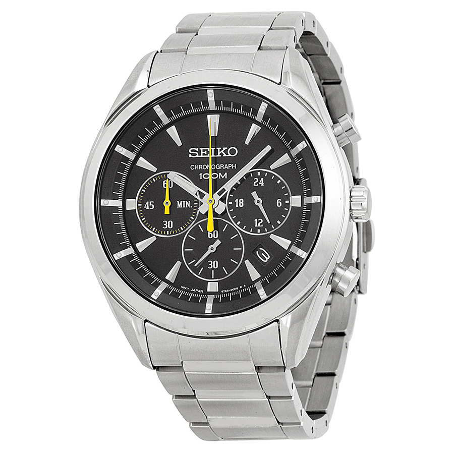 Stainless steel case with a stainless steel bracelet. Fixed stainless steel bezel. Black dial with luminous silver-tone hands and index hour markers. Minute markers. Dial Type: Analog. Luminescent hands and markers. Date display between the 4 and 5 o'clock positions. Chronograph - three sub-dials displaying: 60 second, 60 minute and 24 hour (GMT). Quartz movement. Scratch resistant Hardlex crystal. Pull / push crown. Solid case back. Round case shape. Case size: 42 mm. Case thickness: 11 mm. Band width: 22 mm. Deployment clasp. Water resistant at 100 meters / 330 feet. Functions: chronograph, GMT, date, hour, minute, second. Casual watch style. Watch label: Japan Movt. Seiko Chronograph Black Dial Stainless Steel Mens Watch SSB087.