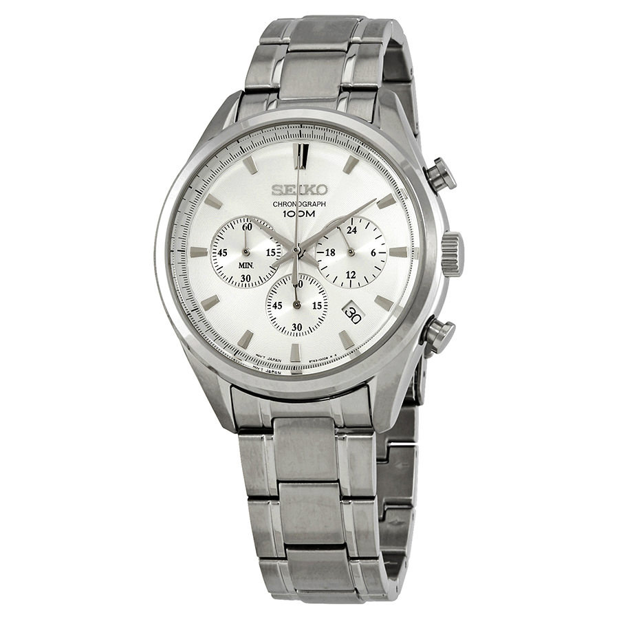 Stainless steel case with a stainless steel bracelet. Fixed stainless steel bezel. Silver dial with silver-tone hands and index hour markers. Minute markers around the outer rim. Dial Type: Analog. Luminescent hands and markers. Date display between 4 and 5 o'clock position. Chronograph - three sub-dials displaying: 60 minute, 60 second and 24 hour. Seiko caliber 8T63 quartz movement. Scratch resistant Hardlex crystal. Pull / push crown. Solid case back. Round case shape. Case size: 42.2 mm. Case thickness: 13 mm. Band width: 20 mm. Fold over with push button release clasp. Water resistant at 100 meters / 330 feet. Functions: chronograph, date, GMT, second time zone, hour, minute, second. Sport watch style. Watch label: Japan Movt. Seiko Chronograph Silver Dial Mens Watch SSB221P1.