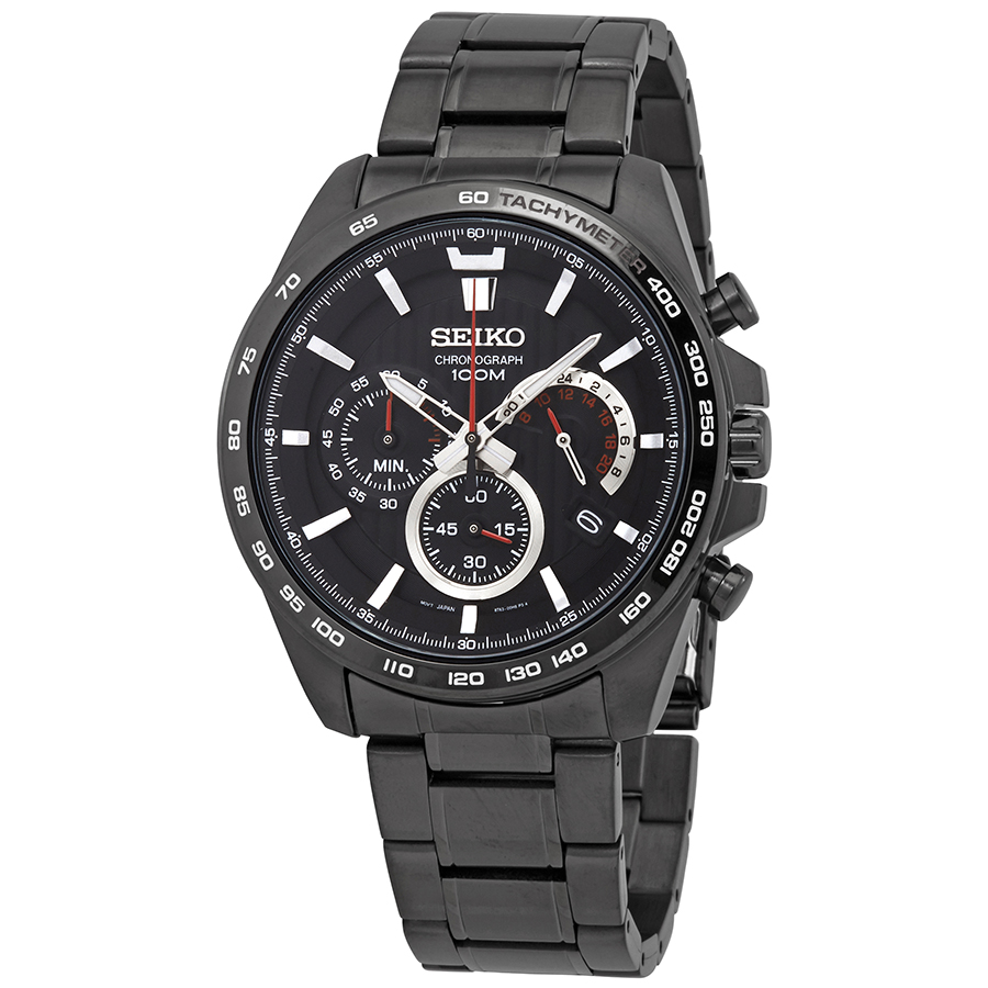 Black-plated stainless steel case and bracelet. Fixed black-plated bezel showing tachymeter markings. Black dial with luminous silver-tone hands and index hour markers. Minute markers around the outer rim. Dial Type: Analog. Luminescent hands and markers. Date display at the 4 o'clock position. Chronograph - three sub-dials displaying: 60 second, 60 minute and 24 hours. Seiko caliber 8T63 quartz movement. Scratch resistant Hardlex crystal. Pull / push crown. Solid case back. Round case shape. Case size: 44 mm. Case thickness: 11 mm. Band width: 22 mm. Deployment clasp. Water resistant at 100 meters / 330 feet. Functions: chronograph, tachymeter, date, hour, minute, second. Sport watch style. Watch label: Japan Movt. Seiko Chronograph Quartz Black Dial Black-plated Mens Watch SSB311P1.