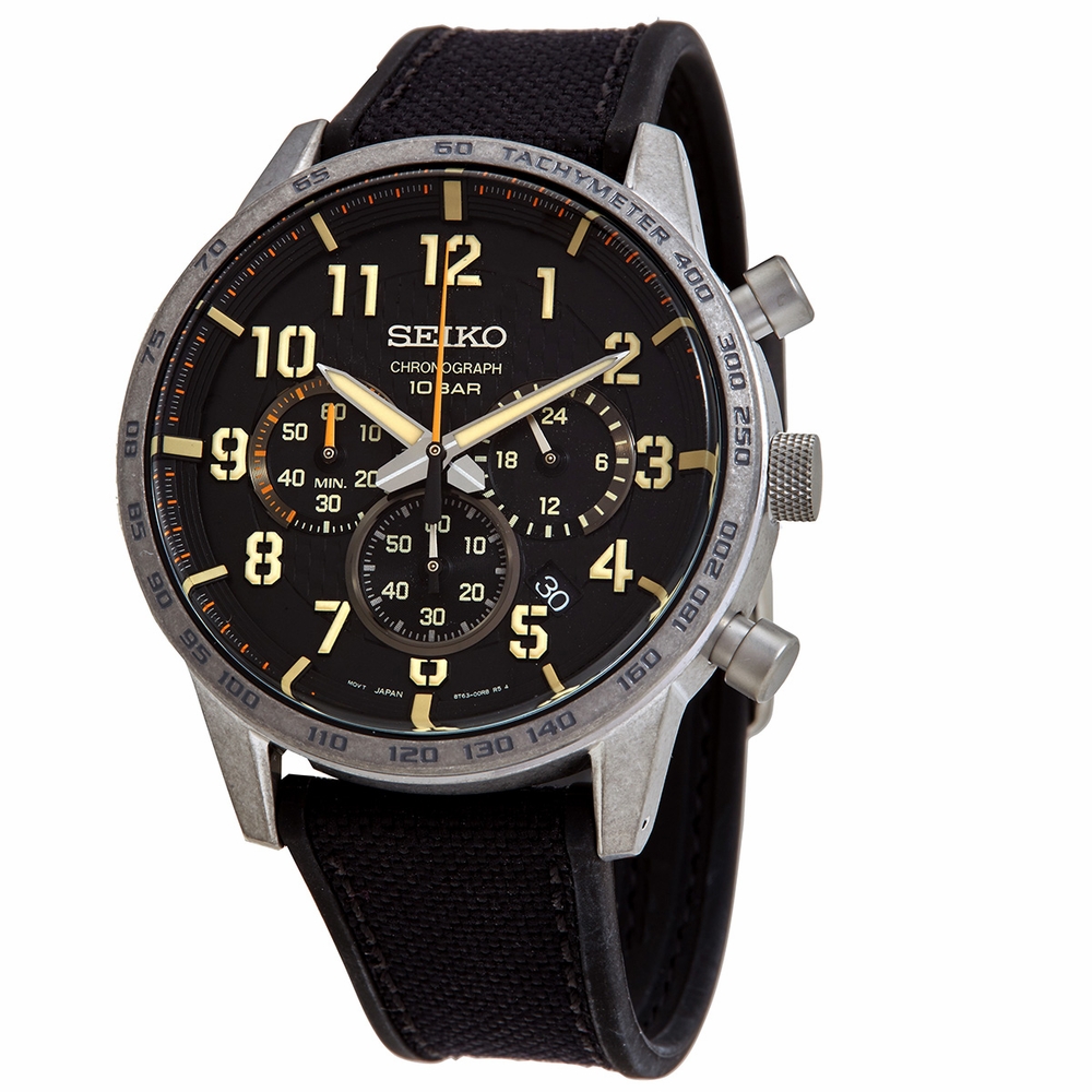 Silver-tone stainless steel case with a black polyurethane strap. Fixed tachymeter scale silver-tone stainless steel bezel. Black dial with silver-tone hands and Arabic numeral hour markers. Minute markers around the outer rim. Dial Type: Analog. Luminescent hands and markers. Date display between 4 and 5 o'clock position. Chronograph - sub-dials displaying: three - 60 minute, 60 second, 24 hour. Seiko Caliber 8T63 quartz movement. Scratch resistant hardlex crystal. Solid case back. Round case shape, case size: 45.2 mm, case thickness: 14.1 mm. Water resistant at 100 meters / 330 feet. Functions: chronograph, date, GMT, second time zone, hour, minute, second. Sport watch style. Watch label: Japan Movt. Seiko Lord Chronograph Quartz Black Dial Mens Watch SSB367P1.