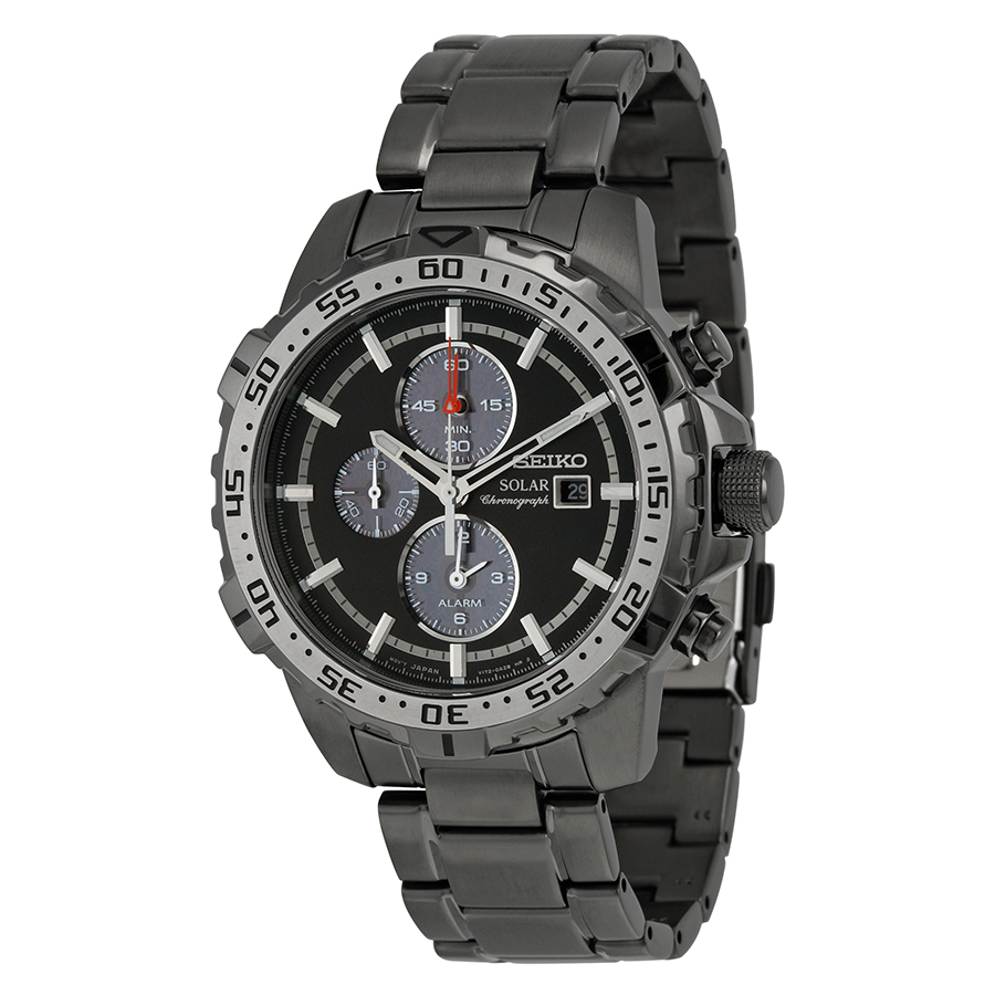 Gunmetal ion-plated stainless steel case and bracelet. Uni-directional rotating gunmetal ion-plated bezel with a grey inlay. Black dial with luminous hands and index hour markers. Minute markers around the outer rim. Dial Type: Analog. Luminescent hands and markers. Date display at the 3 o'clock position. Chronograph - three sub-dials displaying: 60 second, 60 minute and 12 hour (alarm). Solar quartz movement. Scratch resistant Hardlex crystal. Pull / push crown. Solid case back. Case diameter: 44 mm. Case thickness: 12 mm. Round case shape. Band width: 20 mm. Band length: 8.5 inches. Fold over clasp. Water resistant at 100 meters / 330 feet. Casual watch style. Seiko Solar Chronograph Black Dial Gunmetal Ion-plated Mens Watch SSC301.