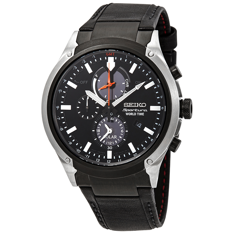 Silver-tone stainless steel case with a black leather strap. Fixed black-plated stainless steel bezel. Black dial with luminous silver-tone hands and index hour markers. Minute markers. GMT markings around the outer rim. Dial Type: Analog. Luminescent hands and markers. Date display at the 4 o'clock position. Chronograph - three sub-dials displaying: 60 second, 24 hour/60 minute and power reserve. Seiko Caliber V195 eco-drive movement. Scratch resistant mineral crystal. Solid case back. Round case shape, case size: 44.2 mm, case thickness: 11.9 mm. Band width: 20 mm. Tang clasp. Water resistant at 100 meters / 330 feet. Functions: chronograph, world time, alarm, date, GMT, second time zone, hour, minute, second, solar-powered. Sportura Series. Sport watch style. Watch label: Japan Movt. Seiko Sportura Alarm World Time Chronograph Mens Watch SSC483.