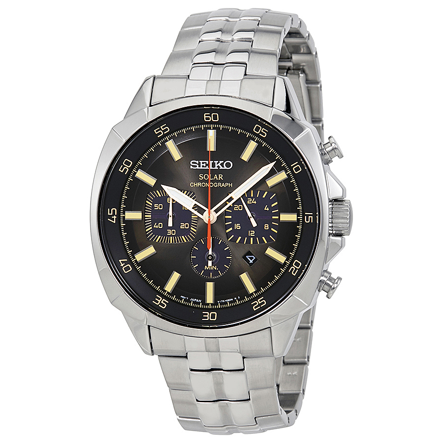 Stainless steel case with a stainless steel bracelet. Fixed stainless steel bezel. Black dial with luminous beige hands and index hour markers. Minute markers around the outer rim. Dial Type: Analog. Luminescent hands and markers. Date display between the 4 and 5 o'clock positions. Chronograph - three sub-dials displaying: 60 seconds, 60 minutes and 24 hours. Seiko caliber V175 quartz movement. Scratch resistant Hardlex crystal. Screw down crown. Solid case back. Case size: 43 mm. Case thickness: 13 mm. Cushion case shape. Band width: 22 mm. Fold over clasp with a safety release. Water resistant at 100 meters / 330 feet. Functions: chronograph, date, GMT, second time zone, hour, minute, second. Sport watch style. Watch label: Japan Movt. Seiko Recraft Chronograph Mens Watch SSC511.